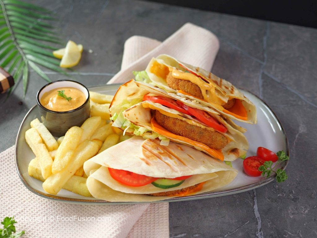 -Add sauce of your choice on one quarter,cheese slice & potato cutlet on second,tomato & cucumber slices on third quarter & add iceberg lettuce on fourth quarter & fold each side on one another making a wrap & serve!