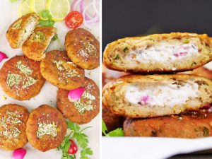 -Chopper mein chicken,adrak lehsan paste,pink salt,dhania powder,kali mirch powder,zeera powder, elaichi powder,breadcrumbs,anda,garam masala powder,lemon juice aur margarine dal kar achi tarhan chop kar lein.