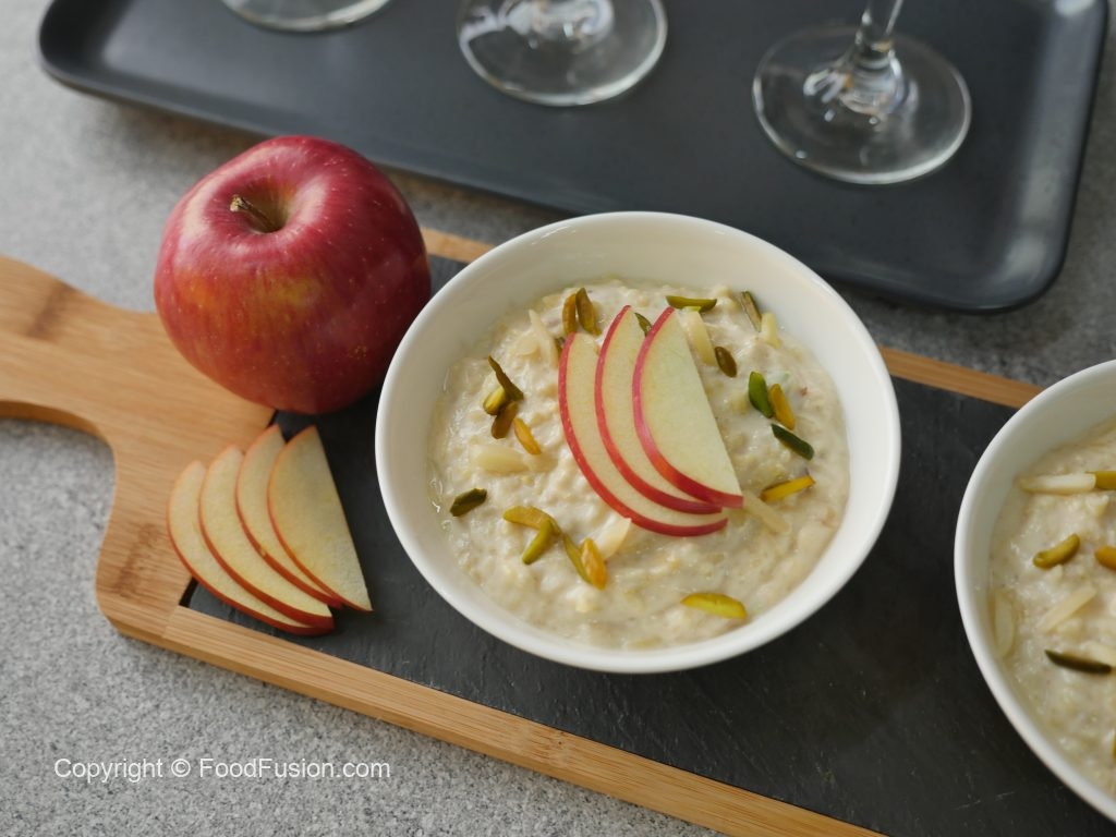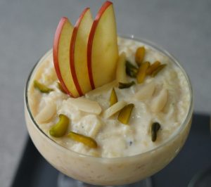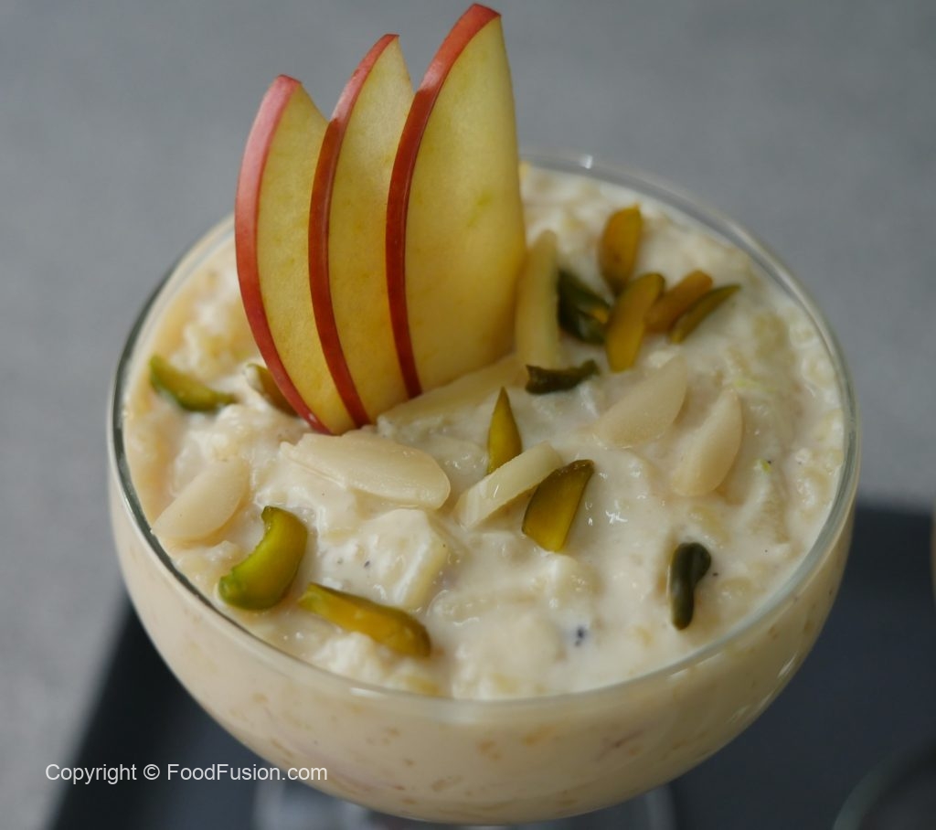 In serving dish,add apple kheer and garnish with apple slices,pistachios and almonds.