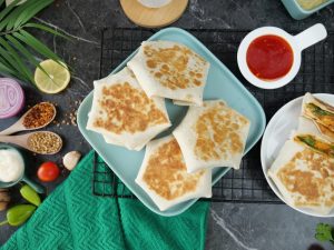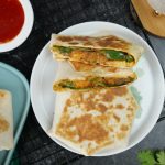 -Tortilla per salad patta,tayyar mayo & yogurt sauce,tayyar bbq chicken filling,mayo & yogurt sauce & cheese slice dal ker edges ko fold ker ka center ko cover ker lein.