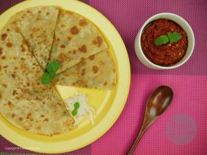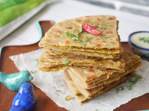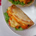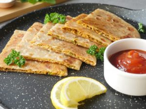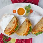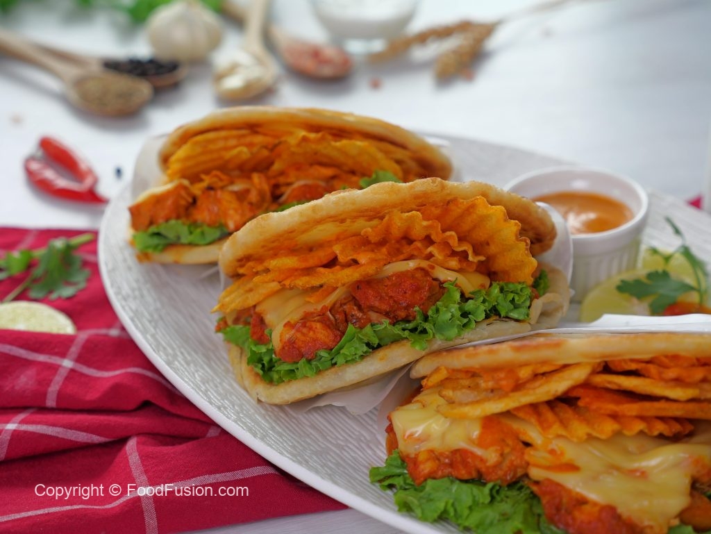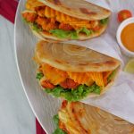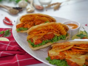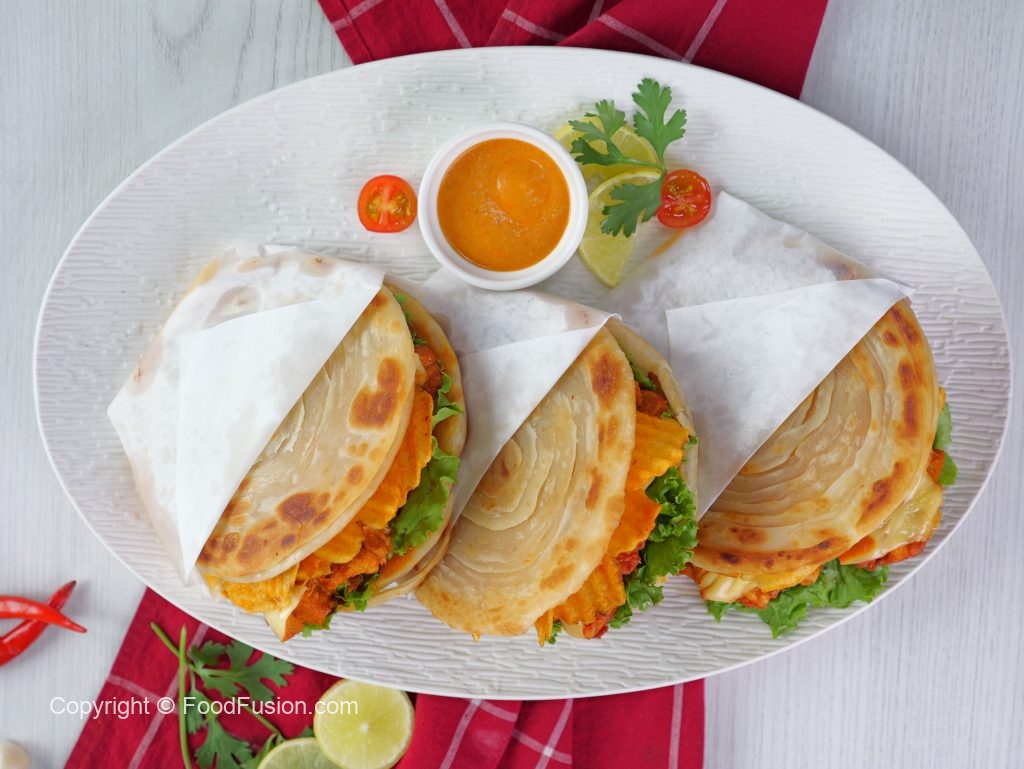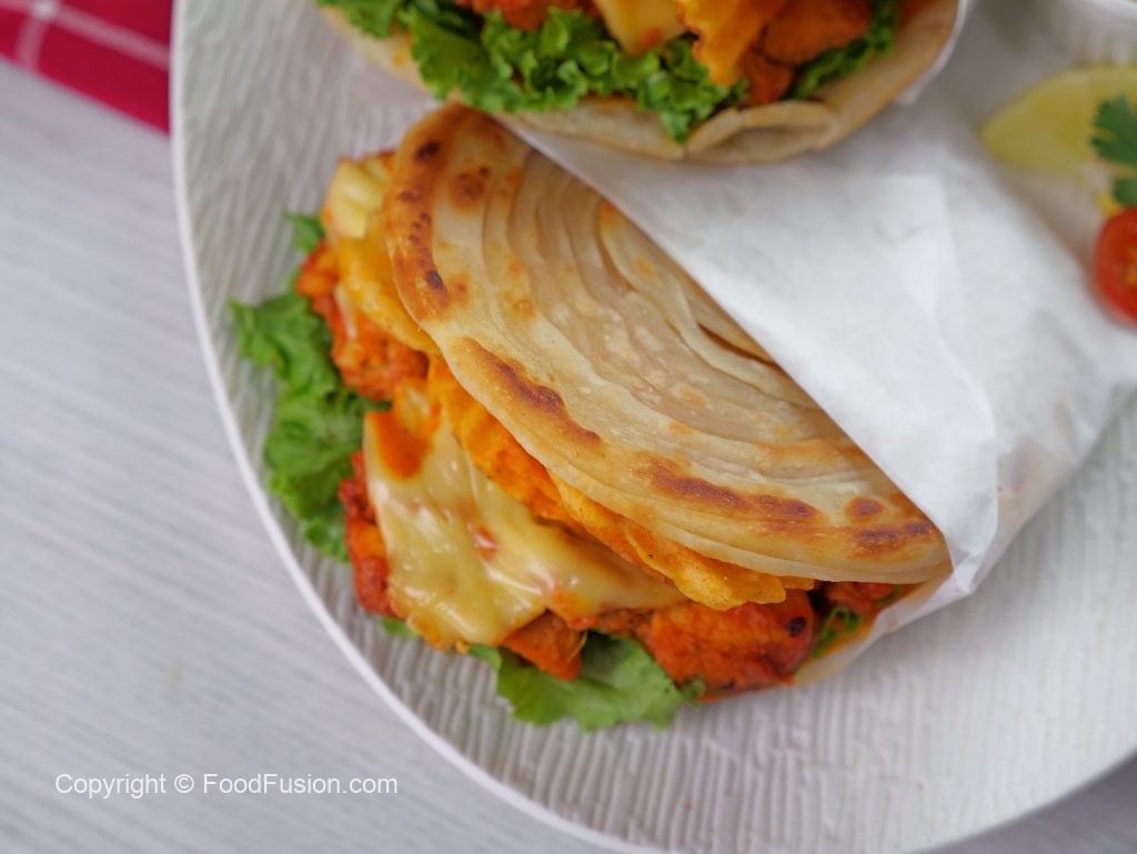 -On paratha,add prepared butter chicken sauce,salad leaves,chicken filling with cheese,chips,prepared butter chicken sauce & cover with another paratha (makes 4) & serve!