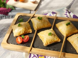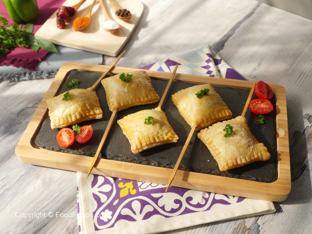 At one corner of the piece,place skewer,add prepared chicken filling (1 tbs) and cover with another piece,press and seal the edges with the help of the knife (makes 20).