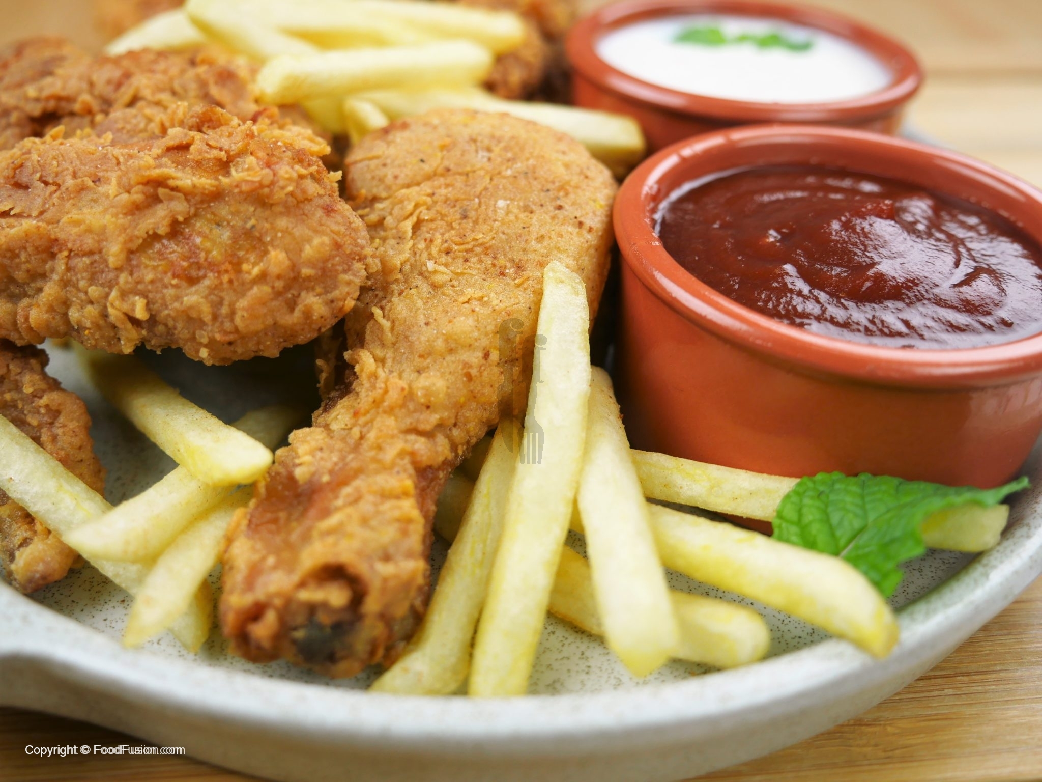 Jab chicken ka marination waqt mukammal hojaye to chicken ko pehle maida ke mixture phir phenta hua anda aur doodh ka mixture main dip karein and akhir main phir maid aka mixture main coat kar lein. Zada der nahi rakhein aur jald oil main daal ke fry karein warna crisp coating nahi hogi. Low-medium aanch pe chicken ko fry karein. Zada nahi rukh badlein warna coating utar jayegi.