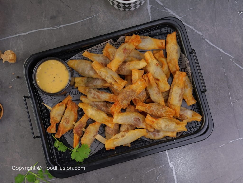 -Cut roll sheets (3x3 inches),add prepared chicken mixture (1 tsp),apply flour slurry & fold in candy shape.