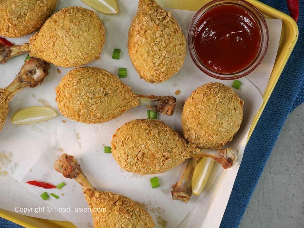 -Coat chicken drumsticks with all-purpose flour,dip in whisked eggs then coat with cornflakes.