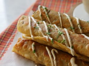 Corn tortilla per cheese mixture aur chicken fries dal ker roll ker lein aur toothpick laga lein.