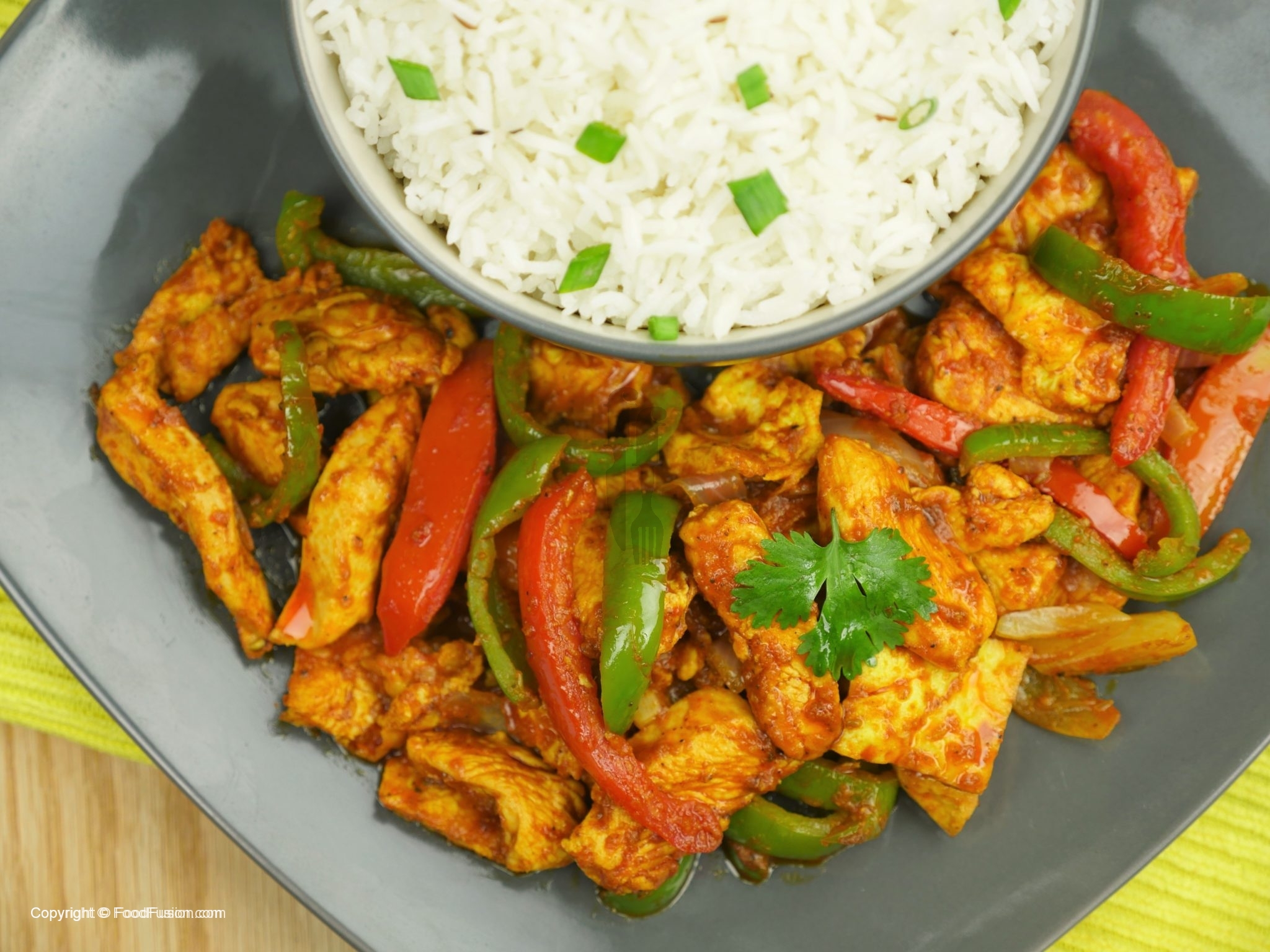 Chicken Jalfrezi tayyar hai, chawal ka saath serve karein.