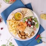-On serving plate,add hummus,iceberg lettuce,salad,poatao fries,shawarma chicken slices,feta cheese,white sauce,red sauce,lemon juice,sumac powder,fresh parsley,pita bread & serve!