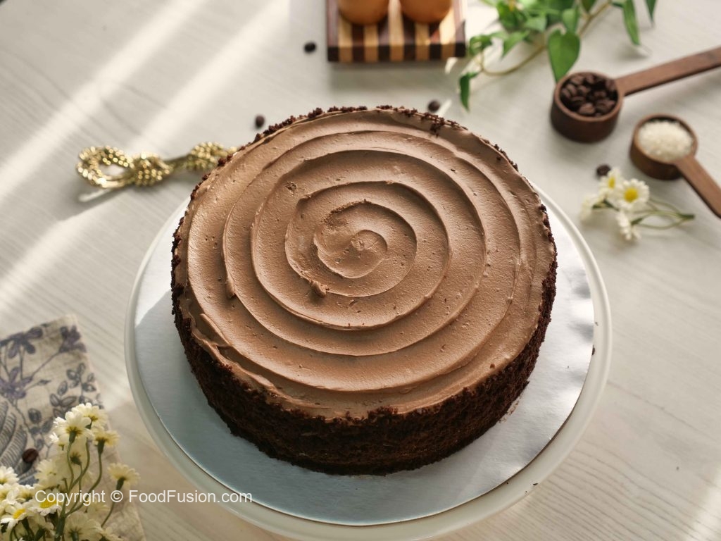 -Cake ki first layer ko cake stand per rakh dein aur sugar syrup drizzle ker ka tayyar frosting laga lein.