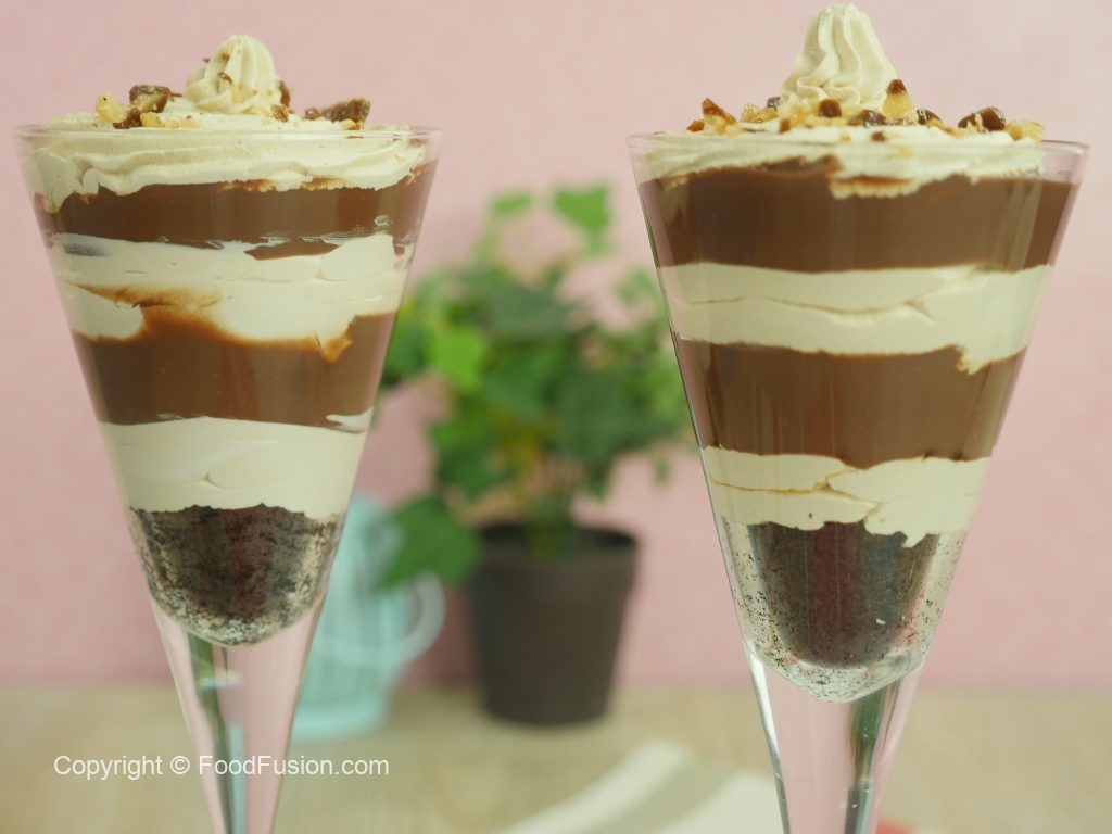 In serving glass,add crumbled brownie,coffee whipping cream,crushed coffee candy,prepared chocolate custard,coffee whipping cream and crushed coffee candy.