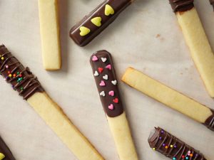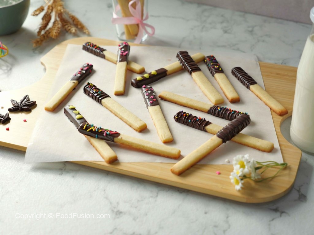-Cookie sticks ko melted chocolate mein dip karein aur multi sprinkles se decorate karein.