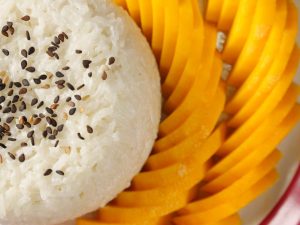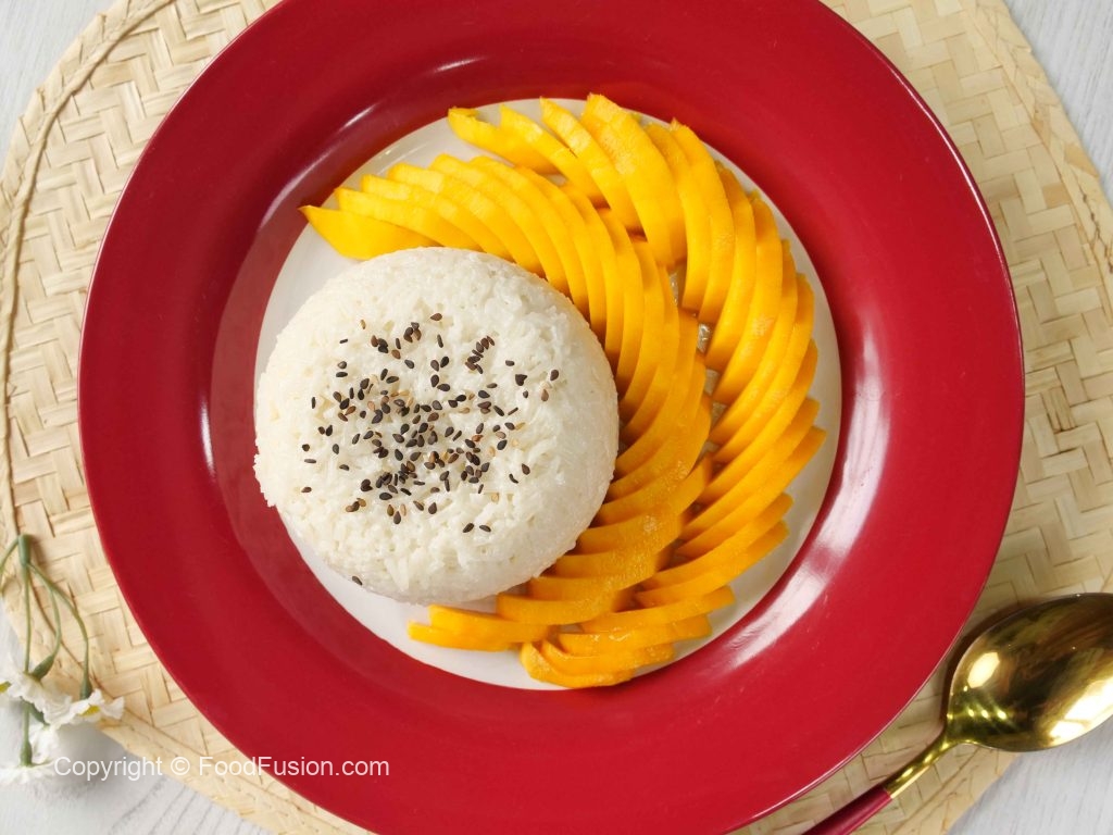 -Serving plate mein sticky rice,mango slices,kalay til aur creamy coconut sauce dal kar serve karein!