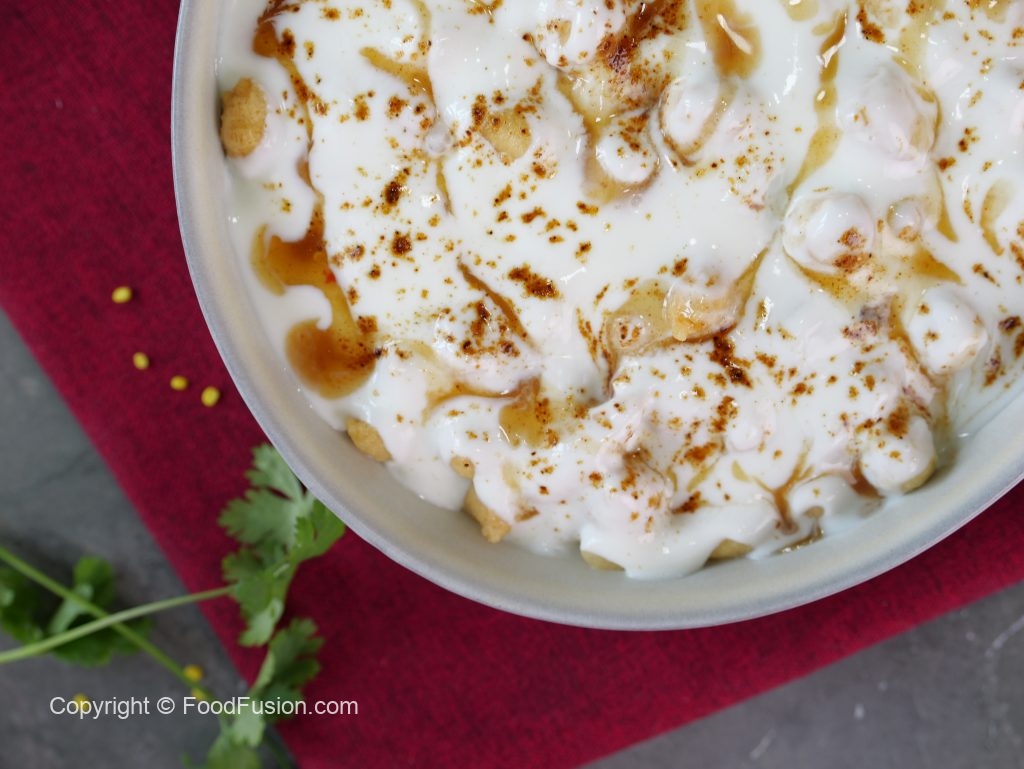 -In a serving dish,add phulkiyan,creamy yogurt,gur imli ki chutney,chaat masala & serve!