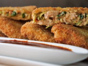 Add and spread chili garlic sauce,add mozzarella cheese,green onion leaves,cooked chicken pieces, coleslaw in the center and fold the top side so that it covers the filling.