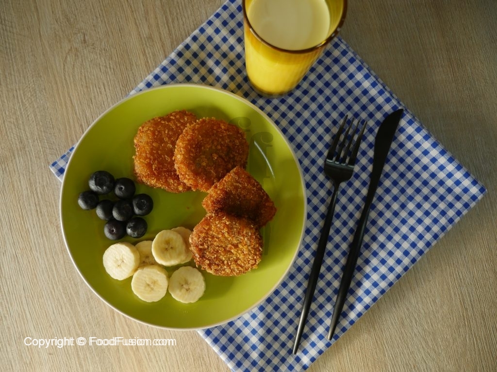 Now dip bread slices into beaten egg then coat in corn flakes.