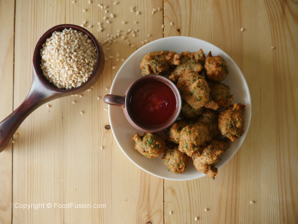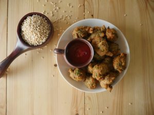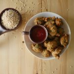 Grease ramekins with olive oil and add 1 & ½ tbs of prepared pakora batter.