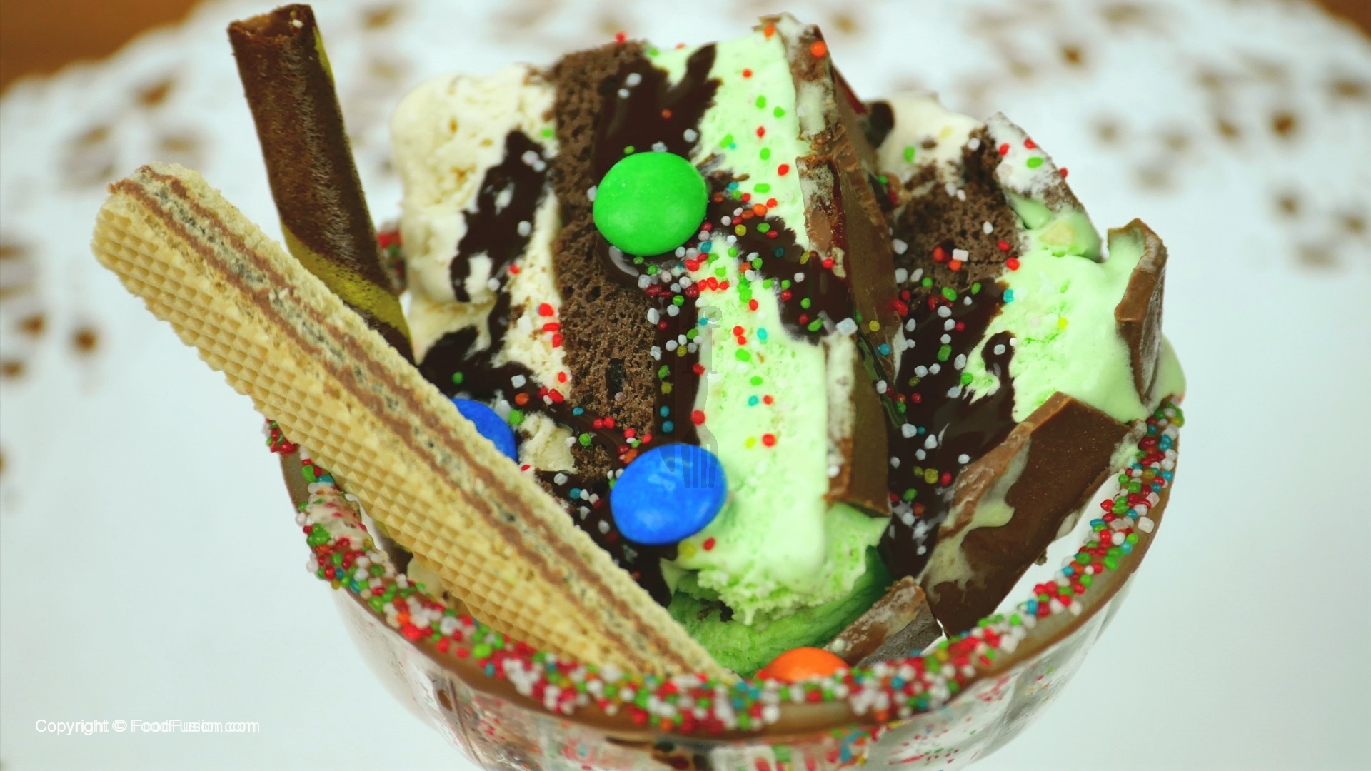 For glass decoration,take ice cream bowl, dip into melted chocolate and coat with rainbow sprinkles.