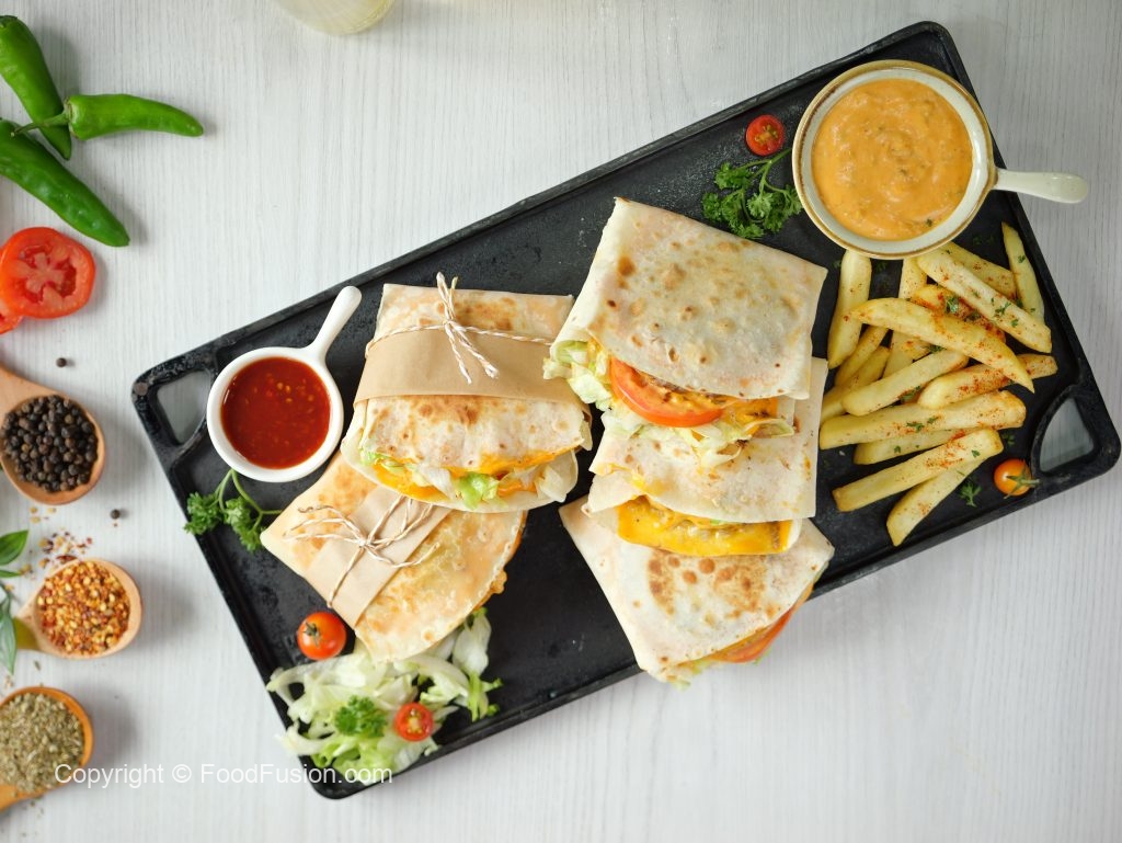 -On a tortilla wrap,place two cheddar cheese slices,beef patty on one cheese slice,iceberg,tomato, prepared burger sauce on beef patty & fold sides to make a wrap.