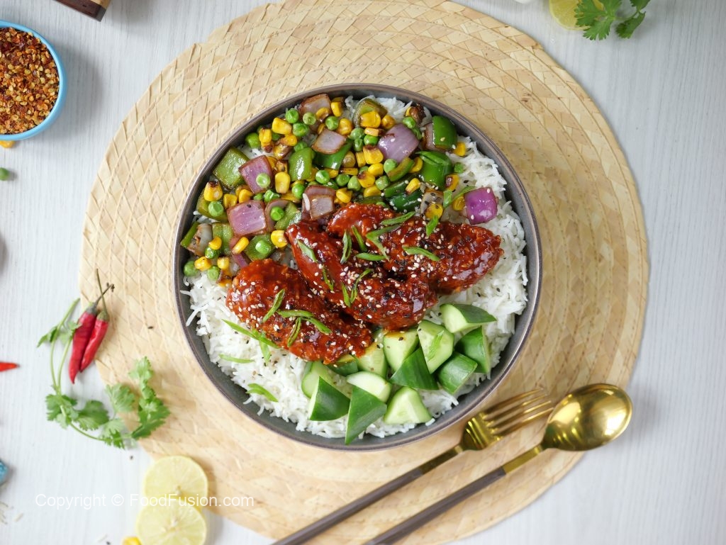 Sweet meets spicy in this Honey Sriracha Crispy Chicken Rice Bowl. A perfect blend of crispy chicken, tender rice, and a kick of fiery flavors. Dive into the deliciousness! #happycookingtoyou #foodfusion #araywahh