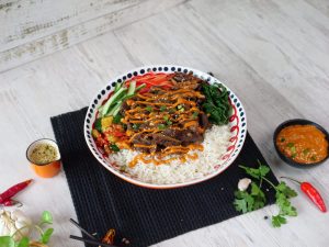 -In a serving bowl,add cooked rice,beef bulgogi,steamed spinach,stir fried shiitaki mushrooms,carrots, cucumber & kimchi.