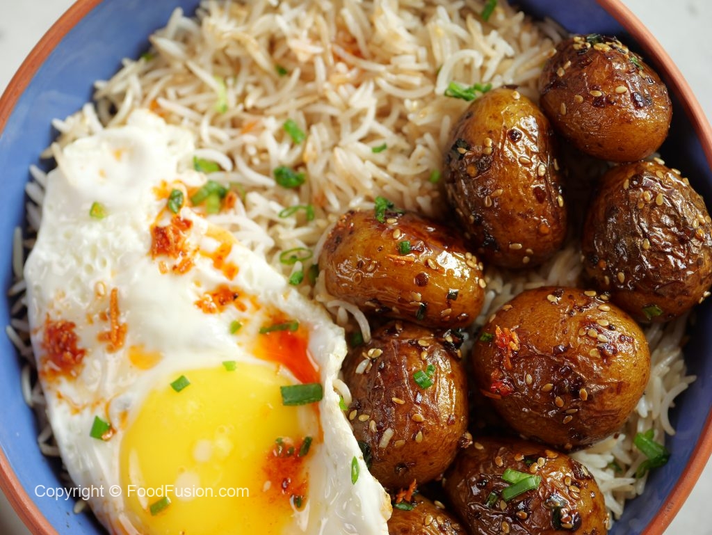 -In a serving bowl,add korean rice,korean potatoes & fried egg.