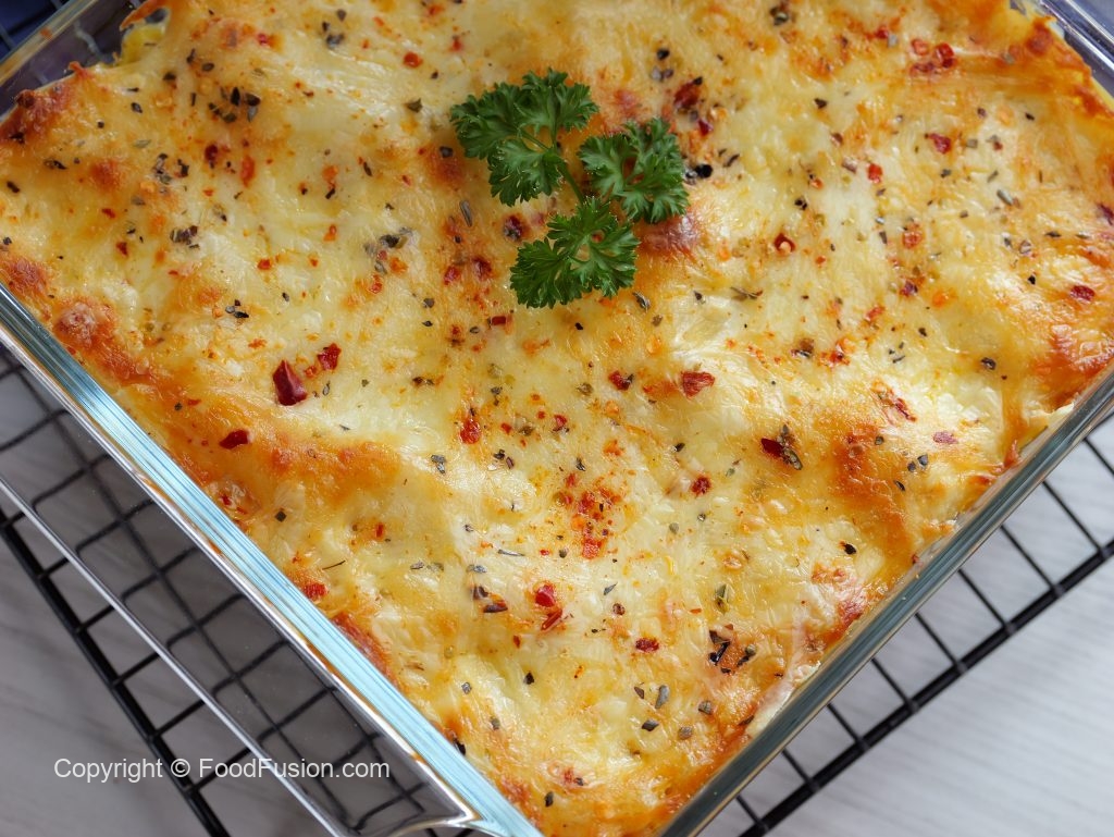 -In a (7.5 X 7.5 inch) oven safe baking dish,add & spread red chicken sauce,lasagna sheets,white sauce,red chicken sauce,cheddar cheese,mozzarella cheese,lasagna sheets,white sauce,red chicken sauce,cheddar cheese, mozzarella cheese,lasagna sheets,white sauce,cheddar cheese,mozzarella cheese,dried oregano & red chilli crushed.