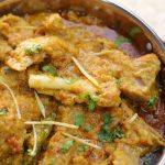 -Scum ko remove ker lein,pink salt,adrak lehsan paste, aur hari mirchein dal ker ache tarhan mix karein aur dhak ker halki ancch per 90% done ho janay tak paka lein (30-35 minutes) (1 & ½ Cup water should remain).