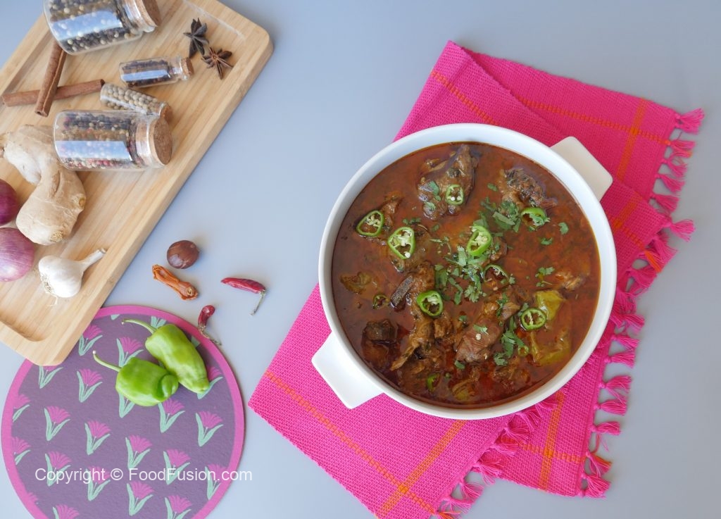 Pani dal ker ubal anay dein aur dhak ker halki ancch per gosht gul janay tak paka lein (35-45 minutes) phir tez ancch per oil alag hunay tak paka lein.