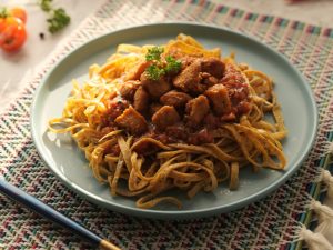 -On a serving plate,add prepared egg noodles,marinara sauce,cooked chicken & serve!