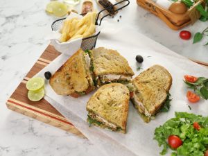 -Bread slice per tayyar pesto sauce dal ker pheela lein,palak,tamatar slice,cheddar & mozzarella cheese,chicken fillet,cheddar & mozzarella cheese aur pesto sauce dal dein aur dosray bread slice sa cocer ker lein aur cheese melt ho janay tak grill ker lein (makes 3).