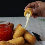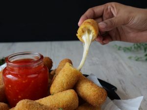 -Place mozzarella cheese stick & roll with the help of greased hand into finger shape stick then seal the edges.