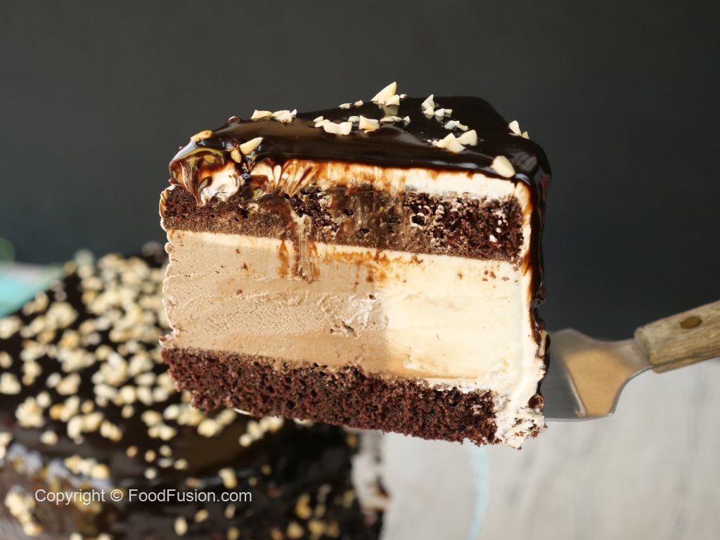 Ice cream layer sa cling film ko remove ker lein & cake layer ka upper rakh dein,chococlate ganache drizzle dal dein,ek aur cake ki layer rakh dein aur cling film sa cover ker ka 4-6 hours kliya freeze ker lein.