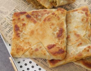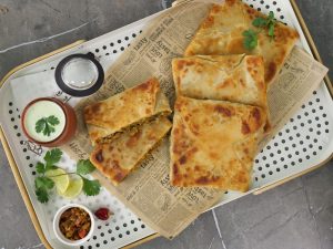 -On rolled dough,add prepared filling,fold one side & apply flour slurry then fold & apply flour slurry & make a square shape paratha.