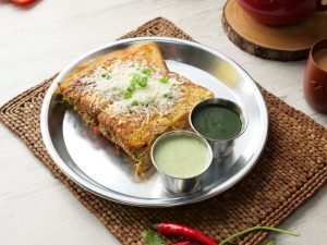 -Add cheddar cheese slice,grated mozzarella cheese,chaat masala then cover with top bread slice to make a sandwich.
