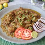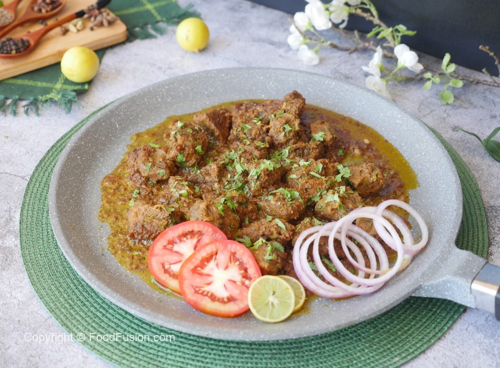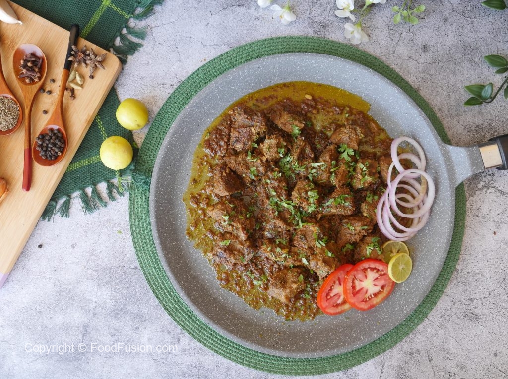 On a girdle brush cooking oil, add marinated beef, cover and cook for 18-20 minutes on low flame.